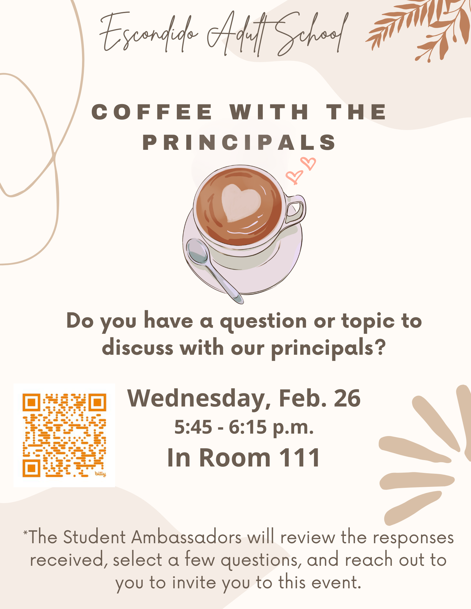 Questions or topics you'd like to discuss with our Principals? Stop by for Coffee w/ the Principal!